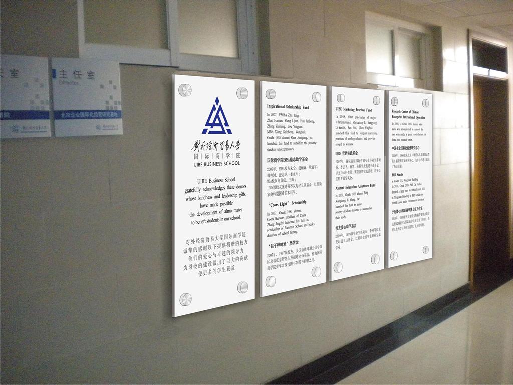 近日,经过院校友会的联系和洽谈,在宁远楼8层国际商学院办公楼道终于悬挂出已经制作完成的我院校友感谢铭牌,引来很多师生驻足浏览。