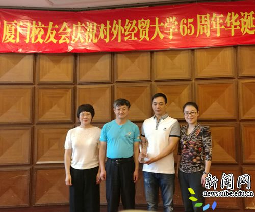 致辞后,杨长春代表贸大校友总会向阮文挺颁发了“校友工作突出贡献奖”奖杯。