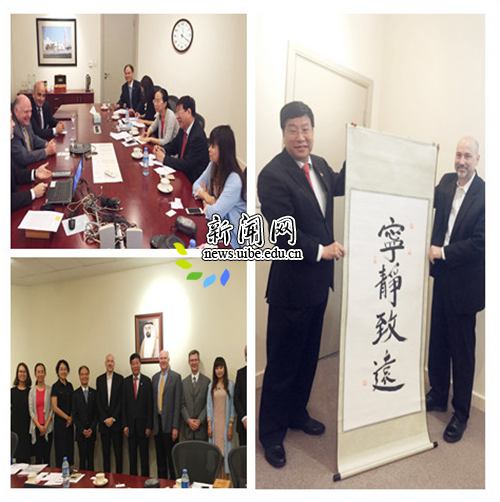 5月24日, 施建军校长一行应邀赴阿联酋访问沙迦美国大学,并会见该校教务长Kevin Mitchell、艺术学院院长Mahmoud Anabtawi、工商管理学院院长Jorg Bley、工程学院院长Leland Blank等。Kevin Mitchell教务长诚望贸大与该校在各个领域展开合作,并介绍了该校的基本情况及其多元文化繁荣的办学特色。施建军校长从贸大65年的发展现状指出,对外经贸大学建校以来坚持国际化办学特色,留学生所占比例在中国大学中名列前茅,希望两校能共同设立中、阿双语人才培训互换机制,并在此基础上开展学生联合培养项目,进一步拓宽两校合作关系。利用两校经济商贸类专业的科研优势,应立足各自优势资源,开展中阿经贸关系和TPP等国际贸易规则的合作研究,共同促进中阿经贸关系的进一步发展。
