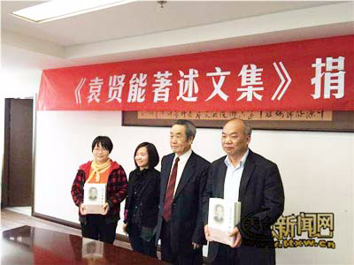 2016年4月20日,我校薛荣久教授和杨凤鸣博士赴浙江天台,代表学校向天台县中学、天台县图书馆赠50套《袁贤能著述文集》。天台县副县长姚乐平、天台县政协副主席曹元新、县府办、宣传部、县教育局、天台中学和县图书馆及相关部门的代表,一起就《袁贤能著述文集》及其文化传承进行座谈。