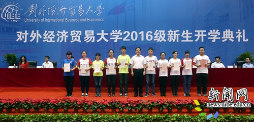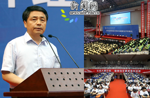 金秋送爽时,九月朝阳又迎莘莘学子;丹桂飘香季,多情惠园再添盈盈新风。2016年9月1日9:00,对外经济贸易大学2016级新生开学典礼在红天体育馆隆重举行。我校蒋庆哲书记,王稼琼校长,陈建香副书记,林桂军副校长、文君副书记、张新民副校长、杨长春副校长,王强校长助理出席了开学典礼。各学院和职能部门负责人、教师代表、校友代表、在校生代表以及我校4000余名2016级全体新生齐聚一堂,共同见证庄严而隆重的入学仪式。