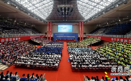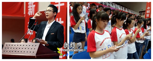 在开学典礼的最后阶段,全体新生一起高声诵读入学宣誓词,主席台领导和教师起立监誓。雄壮的誓言响彻整个红天体育馆,代表了新生们昂扬的斗志和坚定的决心。