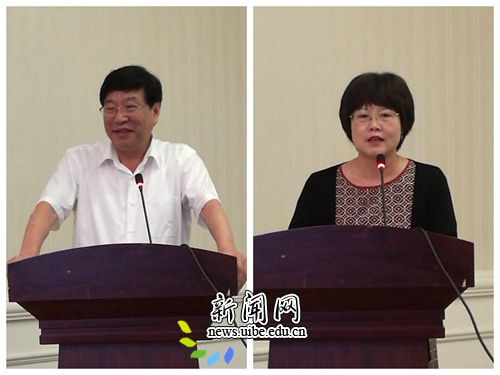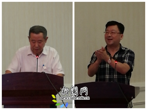 施建军校长讲话(左)、张瑞秘书长宣读贺信(右)