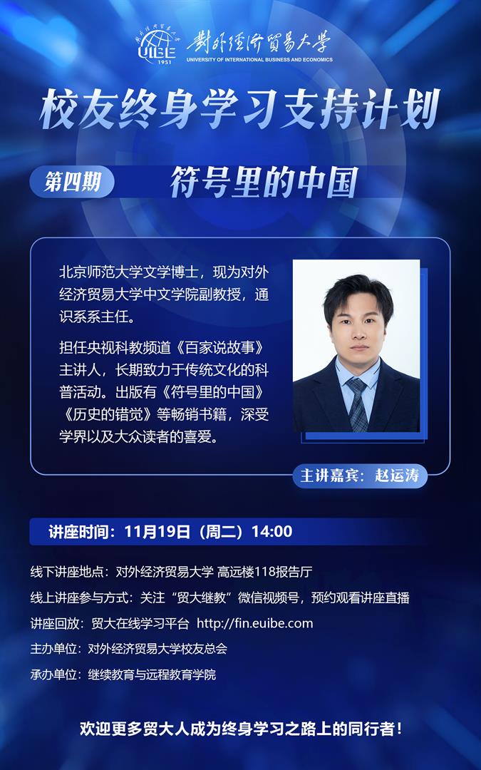 在这诗意满盈的秋冬时节,我们即将迎来一场“蕴”味深厚的文化寻根之旅。对外经济贸易大学校友终身学习支持计划第四期讲座邀请北京师范大学文学博士、我校中国语言文学院赵运涛副教授以“符号里的中国”为主题,深入探究那些最能代表中国文化的符号背后,所蕴含的传统文化典故与当今前沿科技发展之间的神秘联系。本期讲座将于2024年11月19日(周二)14:00开讲。欢迎大家以线上或线下的方式参与聆听。